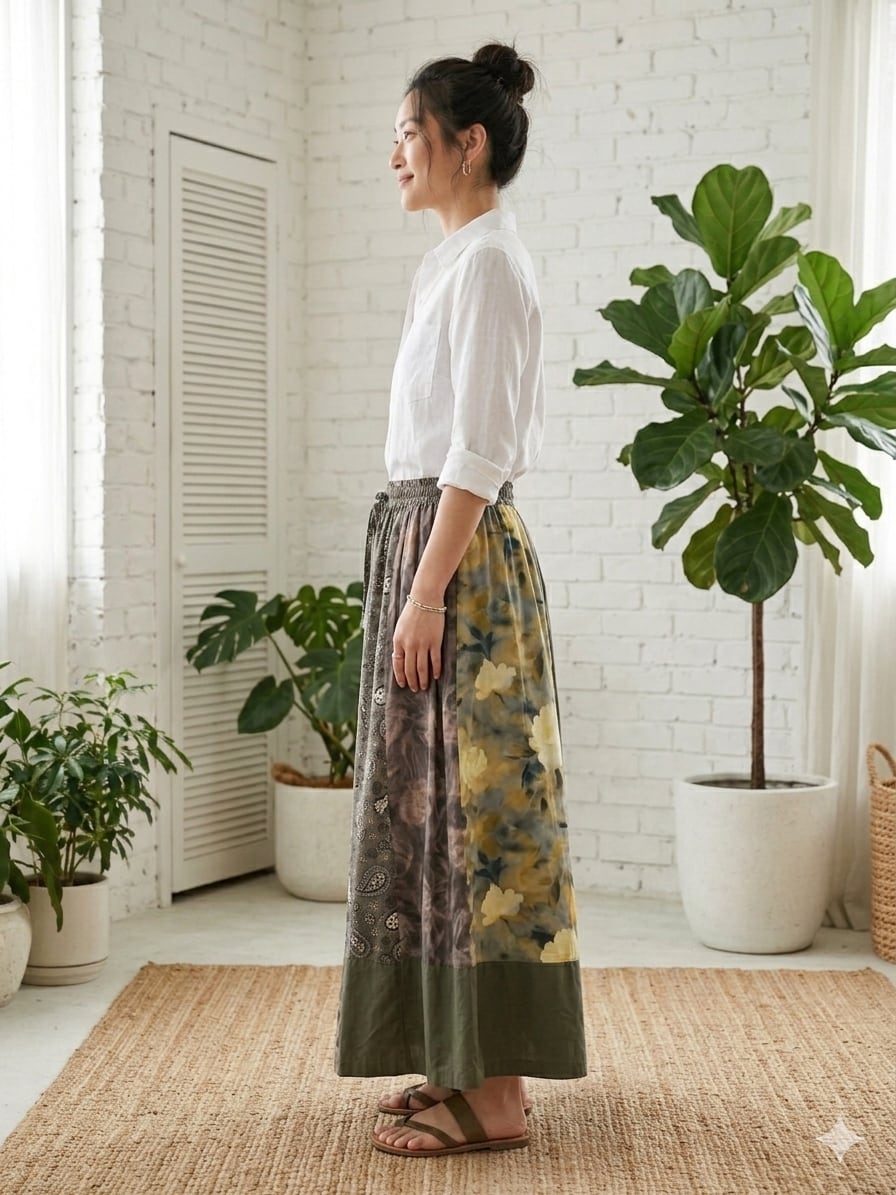 落ち着いたトーンのカーキやグレーをベースに、イエローのバラやペイズリー柄を絶妙なバランスで配置。派手すぎないのに、しっかり個性が出る大人なデザインに仕上げました。
