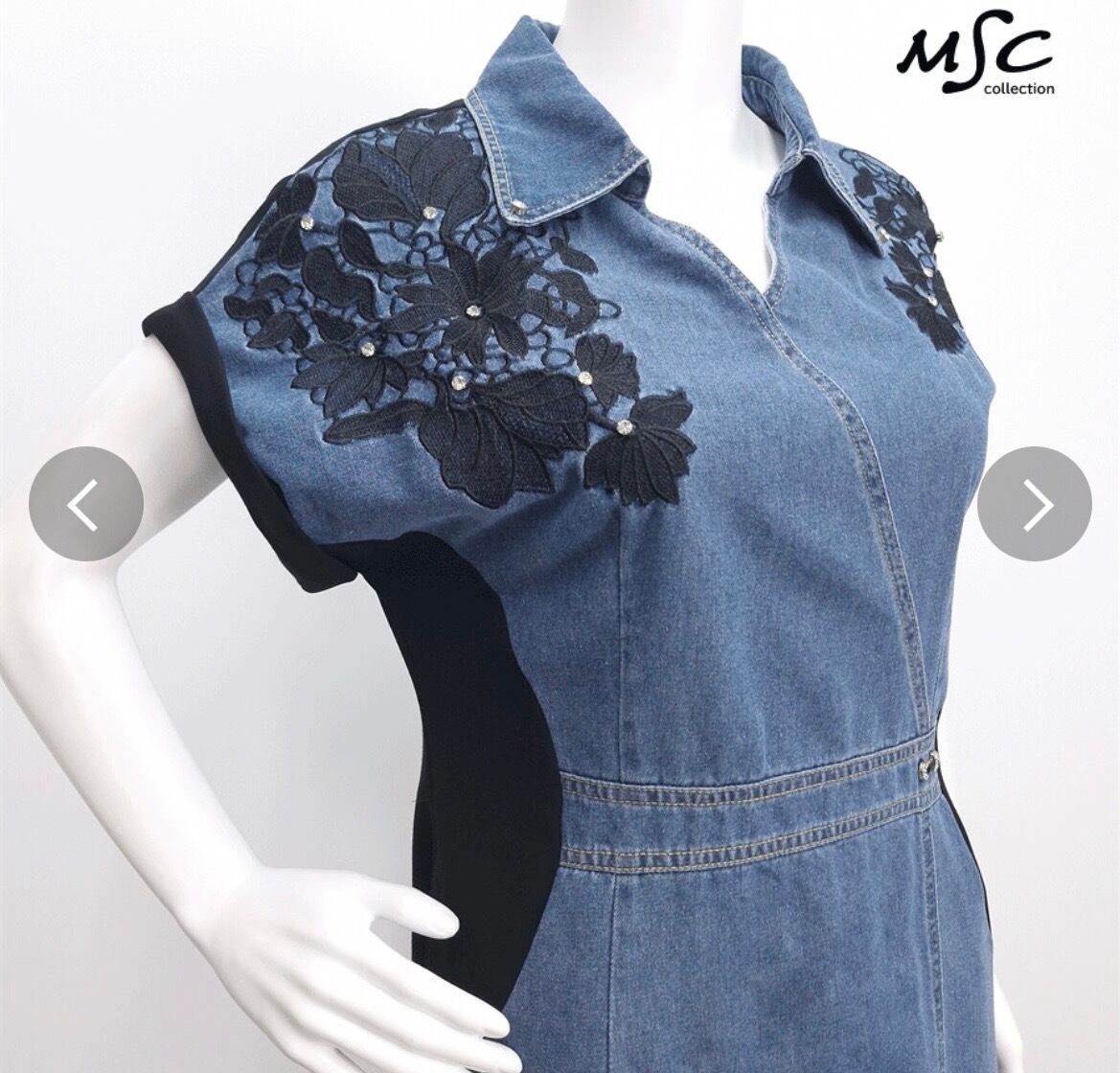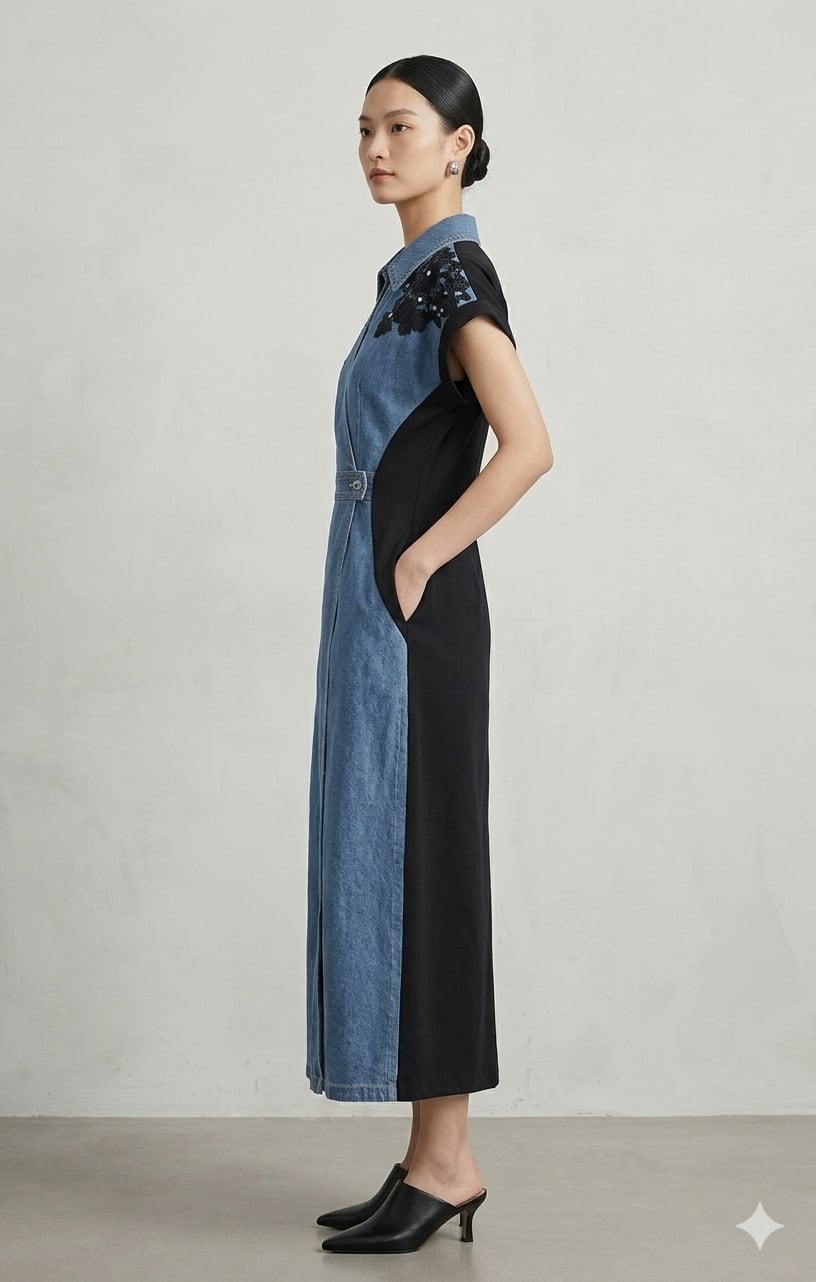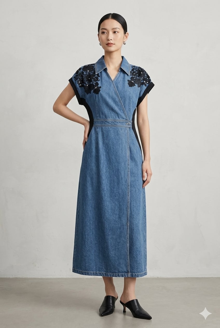 デニム切り替え肩花モチーフワンピース