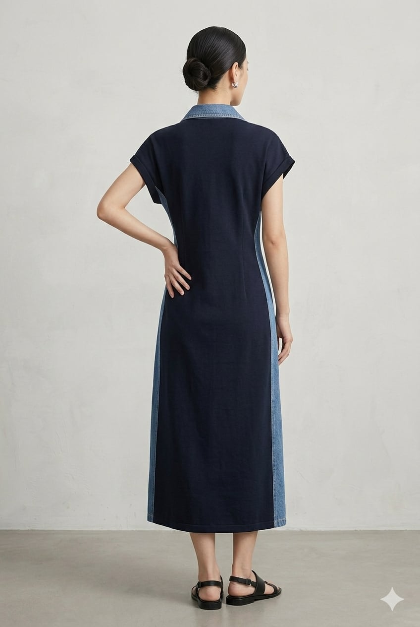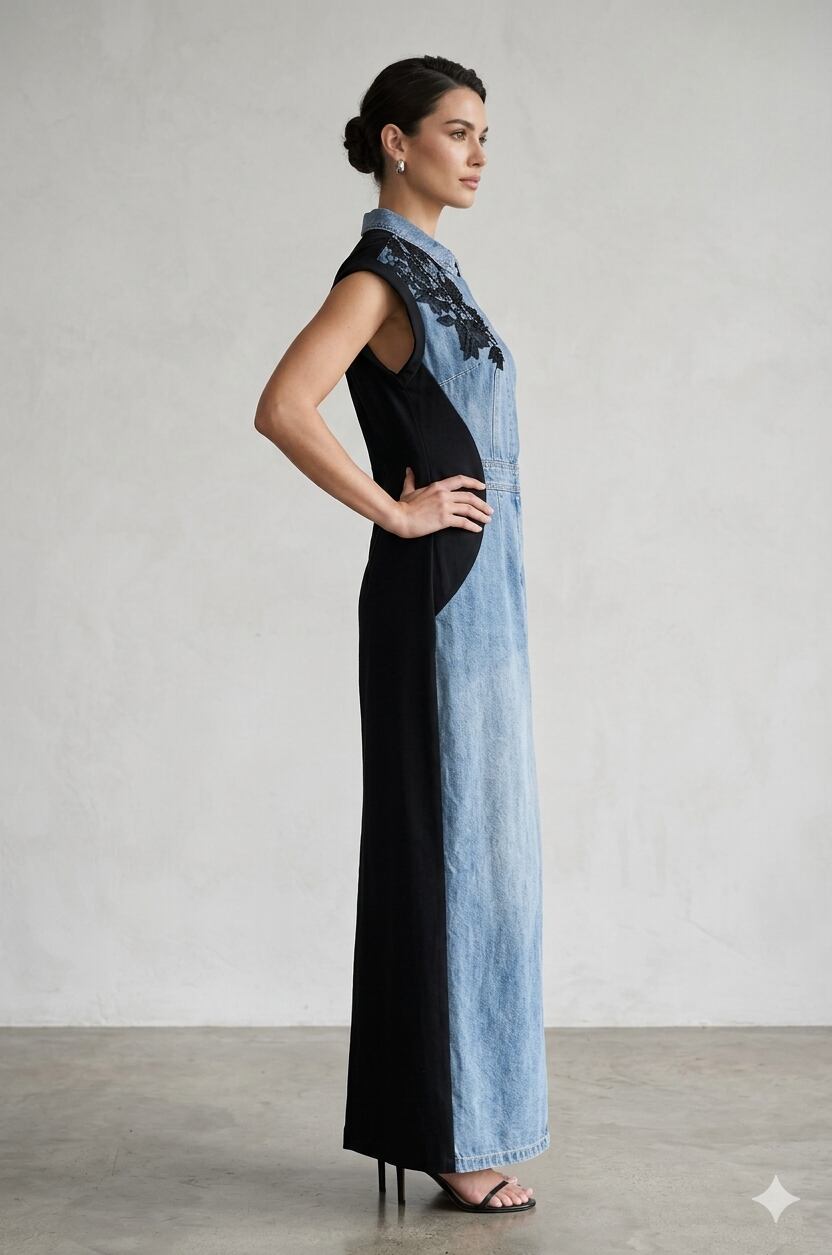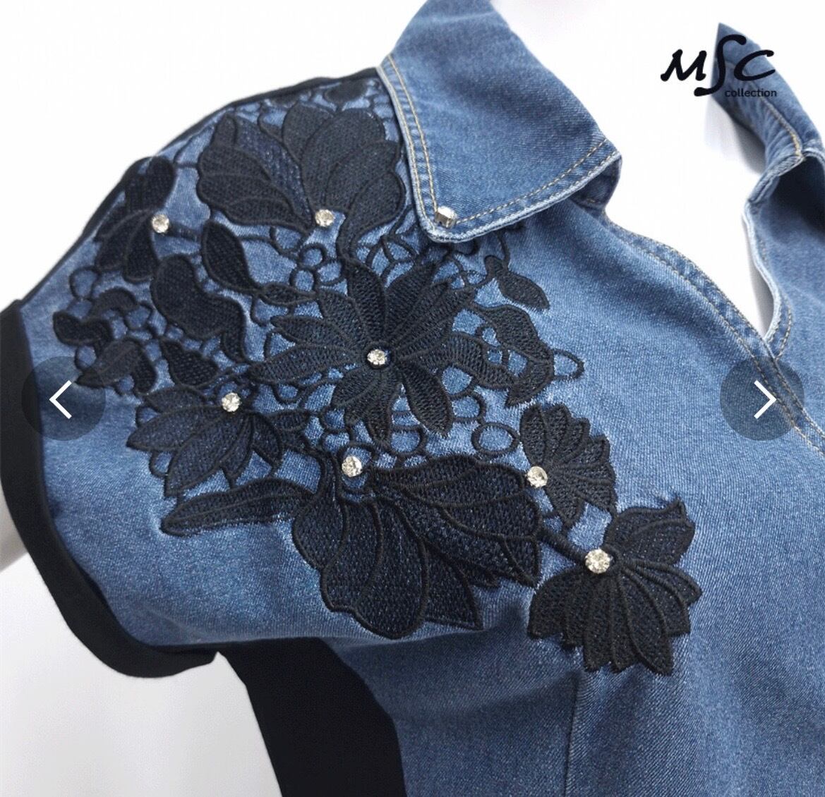デニム切り替え肩花モチーフワンピース