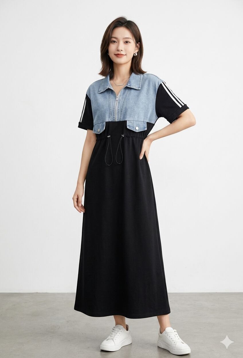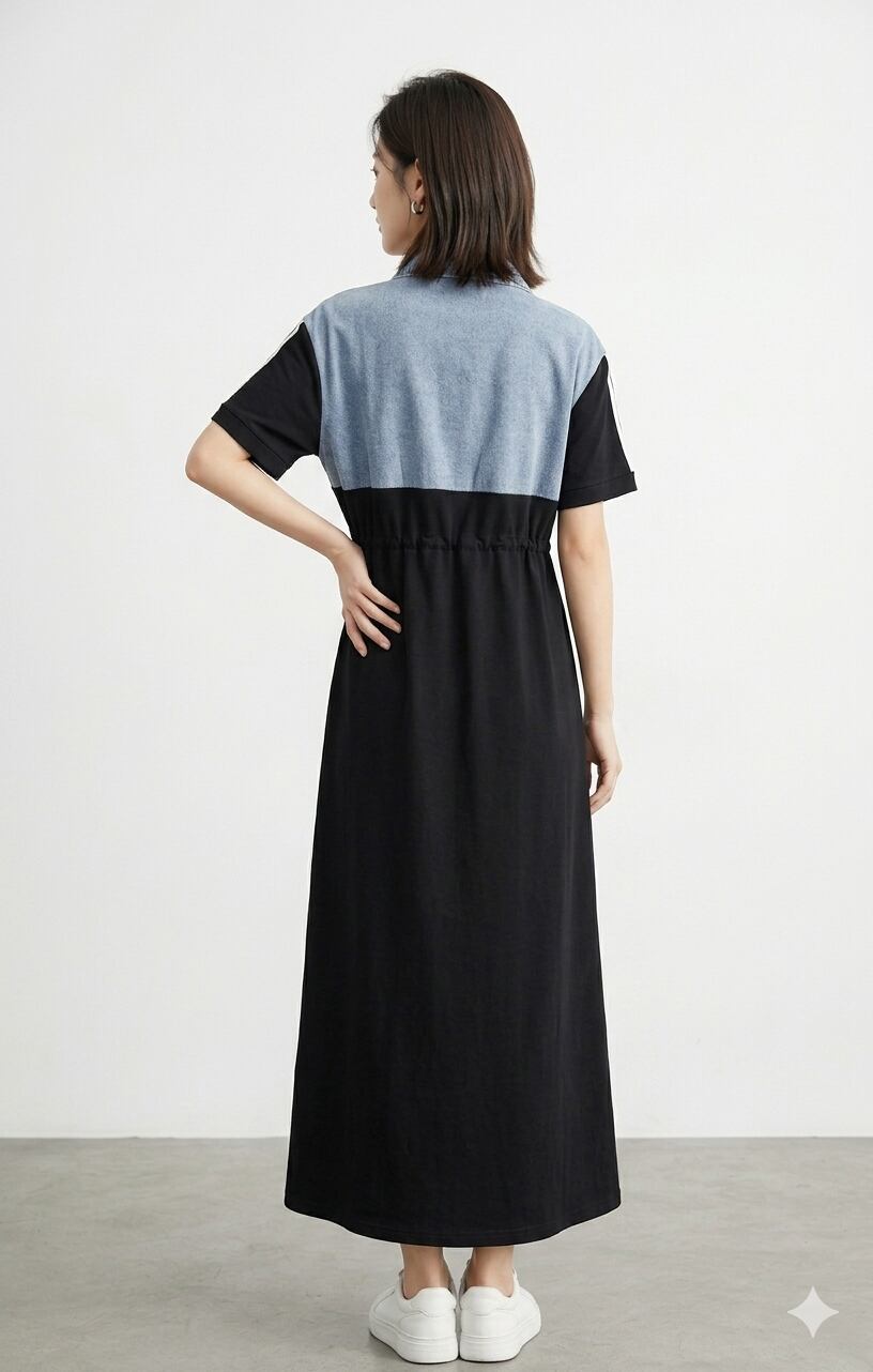 袖ライン入りデニム切り替えワンピース
